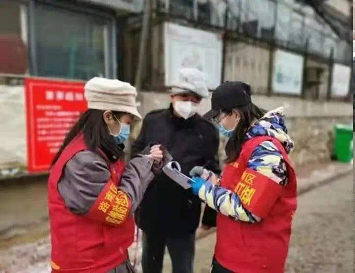 琪琪(右)與同事對出入小區(qū)人員進行登記