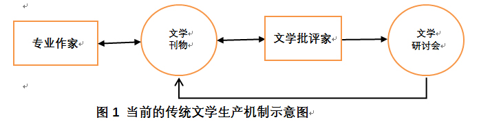 新的文學載體、新的傳播形式制造了新的生產機制,原來的傳統文學生產機制受到了擠壓和沖擊。首先是純文學的受眾即讀者的流失和青黃不接。一方面由于精神娛樂活動范疇的驟然膨脹使原來純文學刊物的大部分受眾不再鐘愛于傳統的文學閱讀,轉而移情于其他更為輕松刺激和感官愉悅的娛樂活動;另一方面成長于市場經濟和消費文化環境中的年輕一代對傳統的純文學缺乏心理和文化認同,無法大量成為純文學的受眾和讀者。其次是原來的大部分業余作家,在傳統的文學生產機制里的上升通道受阻之后不再屬于傳統文學生產機制中的后備能量。第三是網絡文學的興起使得很多文學生產者主動進行了陣地轉移。第四是傳統文學機制自身系統的整體性固化,如圖1所示,時至今日,以作協、紙質純文學期刊和專業作家為主體的傳統的文學生產機制大多仍然固守最初的模式,但其讀者和業余作家的廣大基礎早已不在,傳統的“純文學”成為了作家—刊物—批評家—研討會系統里的自寫、自評與自語。