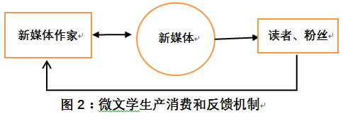 如果說網絡文學使得傳統純文學喪失了半壁江山,那自媒體及社會化媒體的普及則使得傳統的純文學生產完全成了學院和體制內精英知識分子的“小圈子”的行為。自媒體及社會化媒體文學生產的本質特點是“碎片性”,它由原來“資本看不見”的空間生產出來,并且在傳播和消費的過程中悄然實現了碎片空間的再生產,這種生產和傳播及消費的形式在社會功能、審美特征方面都契合當下社會的心理狀態和文化符碼,也恰恰是對信息碎片化的后工業時代的一個文學注解。雖然傳統型的專業作家和批評家、作協仍然依托政治、社會和文化資本掌握著主流的話語權,可以在其話語系統里忽視或者“不承認”微文學創作的文學意義,但傳統的文學生產機制在商業接受和受眾基礎的范疇上已經逐漸被新的生產和消費機制所取代。以自媒體和社會化媒體為代表的碎片化文學、微文學生產自問世起并非是以得到傳統純文學話語體系承認為目的,碎片化文學生產在本質上遵從的是商業資本和消費主義的規則而不是傳統意義上的文學規則,它自有其自身的一套生產機制和遵循的邏輯。文學的意義固然不能僅用商業價值消費邏輯來衡量,但傳統的文學生產逐漸失去受眾基礎和碎片化文學生產的蓬勃現狀卻是怎么都無法掩蓋的一個事實。微文學生產消費和反饋機制如下圖所示。