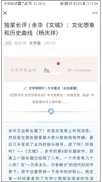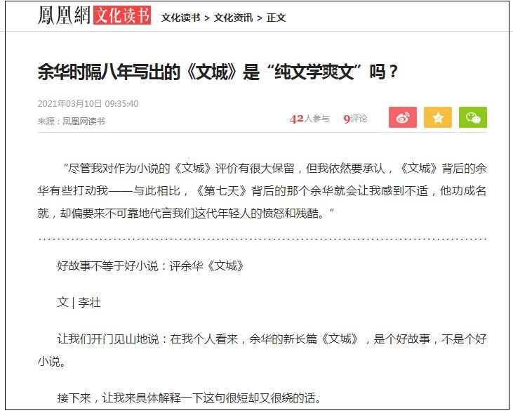 3月10日,鳳凰網(wǎng)-文化頻道發(fā)布青年批評家李壯文章《好故事不等于好小說:評余華〈文城〉》。