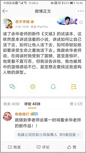 2月26日下午,李健發(fā)微博談論《文城》。截至3月22日,該條微博已獲3.5萬贊,轉(zhuǎn)發(fā)、評論各4000余次。