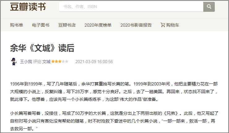 豆瓣用戶王小我對《文城》發(fā)表的評論(節(jié)選)