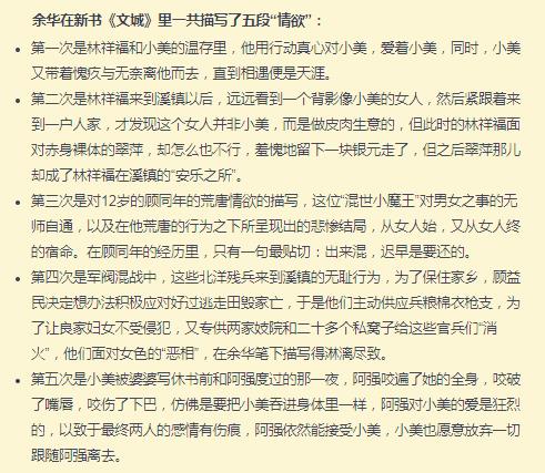 網(wǎng)易號“六秒”對《文城》細讀后,將小說中五次情欲描寫逐一列舉出來。