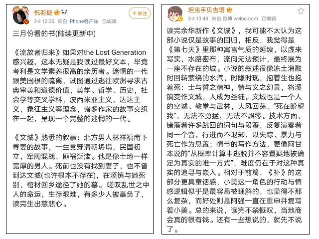人氣作家@祝羽捷和班宇(@坦克手貝吉塔)關于《文城》的微博