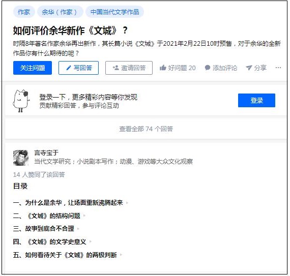 在知乎“如何評價余華新作《文城》”的問答中,已有74條長回答。圖為知乎用戶“言寺寶于”的回答。“言寺寶于”從《文城》的結(jié)構(gòu)、故事、文學史意義等角度出發(fā),并著意于作品出版后的“兩極判斷”,表達了自己的觀點。