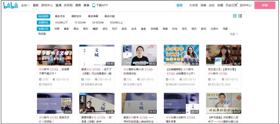 值得關注的當然還有很多來自普通讀者的聲音,在微博、知乎、抖音、B站上,年輕受眾對這部余華新作也保持著極高的熱情,不僅有自媒體接連發(fā)布作品分享讀后感,還有圖書營銷號制作了“《文城》金句摘抄”視頻合集。網(wǎng)友們的回復也很精彩,有人說“好像所有主角的名字都帶‘?!帧保腥苏f“《文城》明顯是《活著》的前傳”。3月11日,“一點資訊”APP推出文化熱點專題,對《文城》進行整體介紹,匯聚了部分關于作品的正面、反面觀點,并允許用戶自由發(fā)布評論及讀后感言。3月12日,新經(jīng)典公司在B站上傳了“拉編輯聊聊”視頻“余華新作《文城》出版幕后大公開”,《文城》責編白雪出鏡和大家講小說編輯背后的故事,在視頻中白雪對書名、封面、印數(shù)、小說特點等方面都做了簡明扼要且適應B站內(nèi)容輸出風格的介紹。
