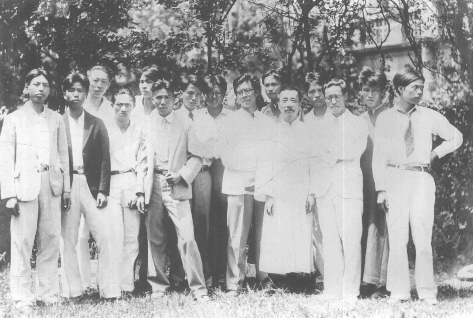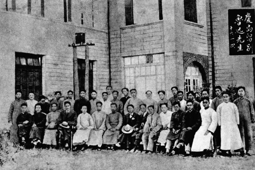 1927年1月4日攝于廈門。在全校師生送別魯迅合影后,文科學生特邀魯迅在群賢樓后面另照一相,“泱泱”“鼓浪” 兩個文學社學生也參與了此次合影。前排左七為魯迅。