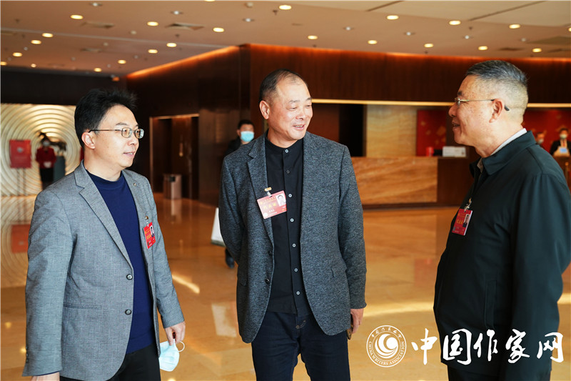 延邊代表團代表鄭風淑、湖北代表團代表劉醒龍、西藏代表團代表次仁羅布交流
