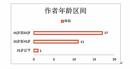 我們將年齡劃分為三個區間,可以看到作者的年齡跨度較大,年齡最小的尚在讀高中,一邊學習,一邊寫作,從事文學創作僅一年。年齡最大的創作至今已有20年。但這也還不是這群作者中創作年限最長的,有人已經有近40年創作歷史,所有作者中有大約三分之二創作年限都在10年以上,可以稱得上是比較有經驗的寫作者了。