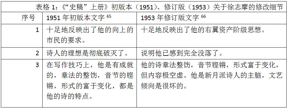既然是組織意義上的“幫助會”,王瑤面臨著巨大的政治壓力,不得不對上冊內容進行修改。被點名的“新月派”,成為修改的“亮點”和“重點”。對比《“史稿”上冊》1951年8月開明書店初版和1953年8月新文藝出版社修訂版,我們發現,王瑤主要對“新月派”前期和后期的論述文字進行過“修改”,呈現出版本的文字差異。“新月派”前期,主要集中對徐志摩涉及到的政治定位和政治評價的文字做了增加,具體集中在三處(如表格所示):