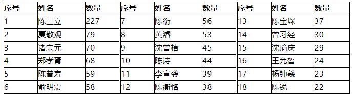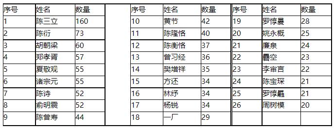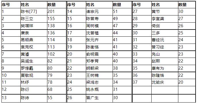 上海《東方雜志》1908-1920年間,“文苑”(包括“詩(shī)選”“海內(nèi)詩(shī)錄”)共101期,165位詩(shī)人發(fā)表了1490馀題舊詩(shī),發(fā)表作品(包括極少量的文和詞)超過(guò)20題的詩(shī)人有18位: