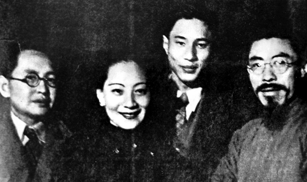話劇《祖國》主創(chuàng)人員。右起聞一多、孫毓棠、鳳子、陳銓(1939年,昆明)
