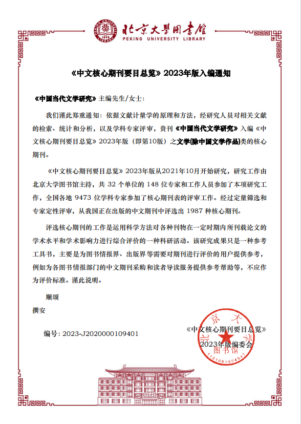 根據(jù)《中文核心期刊目錄總覽》2023年版編委會通知,依據(jù)文獻計量學的原理和方法,經(jīng)研究人員對相關文獻的檢索、統(tǒng)計和分析,以及學科專家評審,《中國當代文學研究》入編《中文核心期刊目錄總覽》2023年版(即第10版)之文學(除中國文學作品)類的核心期刊。