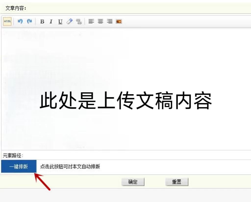 因原創(chuàng)投稿作品文檔中包含來源不明的外網(wǎng)鏈接的情況時有發(fā)生,嚴(yán)重危害網(wǎng)絡(luò)安全,為保障投稿、審稿工作順利進(jìn)行,我們鄭重提示,自本公告發(fā)布之日起,所有投稿作品上傳時請務(wù)必進(jìn)行“一鍵排版”操作(相關(guān)按鍵如圖中紅色箭頭指示)。此外,因詩歌格式特殊,進(jìn)行“一鍵排版”操作后,請作者再根據(jù)具體情形調(diào)整分行排版。
