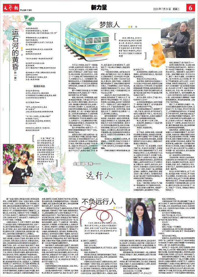 時代更迭,而傳承始終。接續這樣的傳統,在中國作協創研部和中國作協青年工作委員會的大力支持下,我們期望“新力量”能呈現出獨屬于青年人的品質、風格,反映青年作家、文藝工作者深入人民生活,扎根廣闊大地,與時代同呼吸共命運的精神氣象。創刊5年來,專刊重點推介了近百位作家、藝術家。從彼時小有名氣的馬伯庸、石一楓、班宇、笛安、張怡微、石倚潔、林蔚然,到一出現就受到關注的楊知寒、林棹、栗鹿、焦典,再到高校里熱愛文學、癡迷寫作的學子,不唯名氣,不存偏見。“祝福”“子夜”“繁花”“等風來”……主題詞寫作給予初出茅廬的青年和經典作家同臺的機會。朋友圈、IP改編、AI寫作、國潮動漫、短視頻微探、日常生活與非虛構、電子榨菜……凡此種種,不一而足,聚焦各個時期的青年文化熱點。“每個人都是不同的,表達最真誠的看法就好”,每當作者問起有什么特別的要求,我常會這樣回答——給他們開辟深林,他們便真的能走出新的路徑,青年最可貴的,就是這樣的生力。