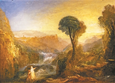 完成于1835年的《帝沃力:托比亞斯和天使》(見圖,馬躪非供圖),著重表現了夕陽下意大利帝沃力山區的旖旎風光。云霞映著落日,藍天逐漸褪去;金色暮靄中,遠山如黛。畫家用薄涂法生動表現出遠處天空和景致的朦朧飄渺,近處的山石和樹木則采用不透明顏色的厚涂法描繪。溪流從遠處山間蜿蜒而至,畫面左側聳立的巨石似乎能反射夕照,透納用近乎干筆皴擦出石頭的肌理和飛濺的浪花,整幅作品既寧靜古典,又壯美神秘。