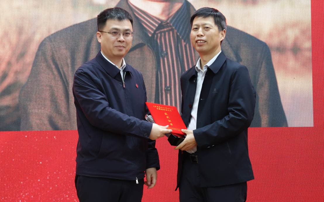 山東出版集團黨委書記、董事長劉文強為賀桂梅頒獎(山東大學文學院研究員尹林代領)