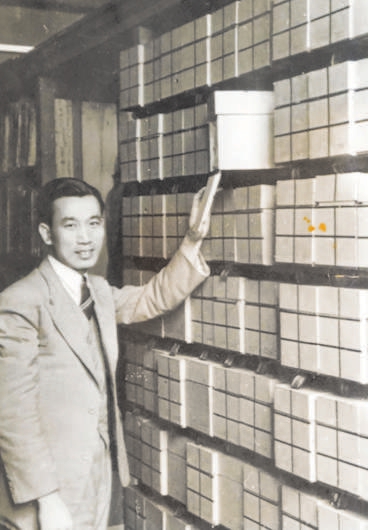 1937年王重民在法國國家圖書館取閱敦煌卷子。