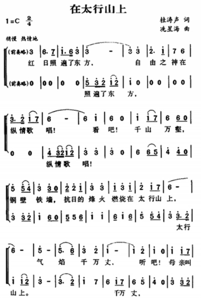 1938年6月下旬,桂濤聲回到武漢,富有鼓動性、戰斗性的抗日歌曲《在太行山上》的歌詞已醞釀成熟。南太行赭紅色絕壁從華北平原拔地而起的雄姿,以及縈繞其間決死抵抗的洶涌民情,通過他滾燙的歌詞,如同狼煙烽火,瞬間點燃了冼星海的澎湃激情。武昌曇華林國民政府軍事委員會政治部第三廳駐地,在借來的一架鋼琴上,歌詞插上了音樂的翅膀。“紅日照遍了東方,自由之神在縱情歌唱!看吧!千山萬壑,銅壁鐵墻,抗日的烽火燃燒在太行山上,氣焰千萬丈,聽吧!母親叫兒打東洋,妻子送郎上戰場。我們在太行山上,我們在太行山上,山高林又密,兵強馬又壯。敵人從哪里進攻,我們就要他在哪里滅亡!敵人從哪里進攻,我們就要他在哪里滅亡!”