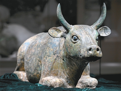 鎏金銅牛作為寧夏博物館的“鎮館之寶”,代表了西夏時期鑄造工藝的最高水平。銅牛1977年出土于銀川西夏陵101號陪葬墓,通體鎏金,內部空心。造型獨特,為跪臥姿勢,雙角彎曲,雙耳外展,鼻子微微上翹,眼睛圓睜且向外凸,注視著遠方,好像勞累一天的黃牛在跪臥休息時,突然聽到遠處主人的呼喚,抬頭遠望、目閃靈光。這件銅牛集塑形、鑄造、鎏金、拋光等多種工藝于一身,達到了神形兼備的藝術效果。以銅牛為隨葬品反映了西夏農耕經濟的興盛。
