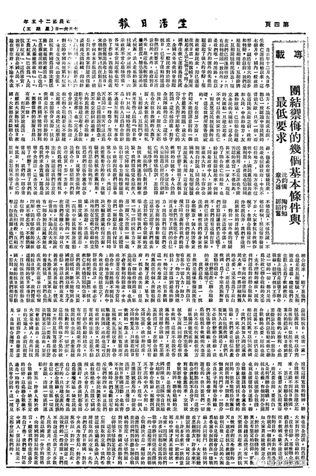 1936年5月31日至6月1日,在宋慶齡、馬相伯、沈鈞儒、章乃器的號召和領導下,“全國各界救國聯合會”在上海召開了成立大會,選舉宋慶齡、何香凝、馬相伯、鄒韜奮等四十余人為執行委員,沈鈞儒、章乃器等十人為常務委員。7月15日,救國會領導人沈鈞儒、章乃器、陶行知、鄒韜奮發表了《團結御侮的幾個基本條件與最低要求》一文,更是明確表示,贊同和支持中國共產黨的抗日民族統一戰線政策。救國會這一代表全國大多數人民意志和要求的呼聲,引起了國內各界人士的重大反響,特別得到了中國共產黨的贊同。
