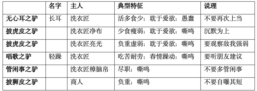 《伊索寓言》中有十幾個關于驢的故事,在內容的豐富性上遠勝印度,驢的形象也更加多元。其中,一個情節類似的故事是“驢和獅子皮”:驢披上獅皮嚇唬眾獸,狐貍因聽過其叫聲而看破其身份。其余有關驢的故事大體可分為數類: