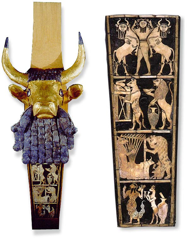 公元前5000年左右蘇美爾牛頭豎琴上的驢奏豎琴圖案