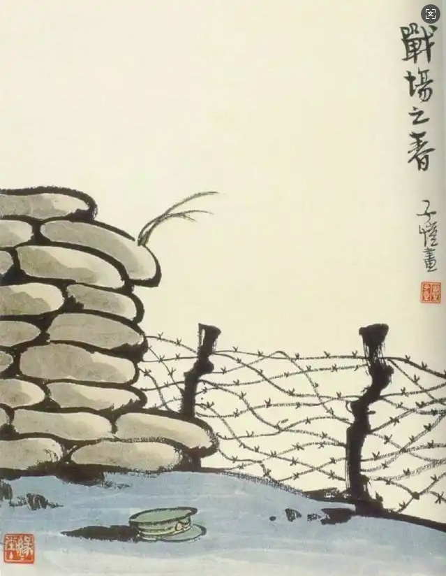 豐子愷堅(jiān)信抗戰(zhàn)必勝,其漫畫(huà)作品灌注必勝的信念,充滿(mǎn)鼓舞人心的力量。他曾說(shuō):“古語(yǔ)云:‘眾志成城’,我們四百兆人團(tuán)結(jié)所成的城,是任何種炮火所不得攻破的!”他的漫畫(huà)作品尺幅小,題材微,卻具有強(qiáng)烈的藝術(shù)感染力。比如《生機(jī)》和《戰(zhàn)場(chǎng)之春》,主角均為一株小草,纖細(xì)柔弱,一棵從灰暗的斷壁中探出頭來(lái),一棵在冰冷的鐵絲網(wǎng)邊昂首向天,寥寥數(shù)筆,生機(jī)立現(xiàn)?!稇?zhàn)場(chǎng)之春》中題詩(shī)曰:“誰(shuí)言爭(zhēng)戰(zhàn)地,春色渺難尋。小草生沙袋,慈祥天地心?!睔埧岬膽?zhàn)場(chǎng)上,小草頑強(qiáng)生長(zhǎng),印證著天地的慈祥之心,好生之德。