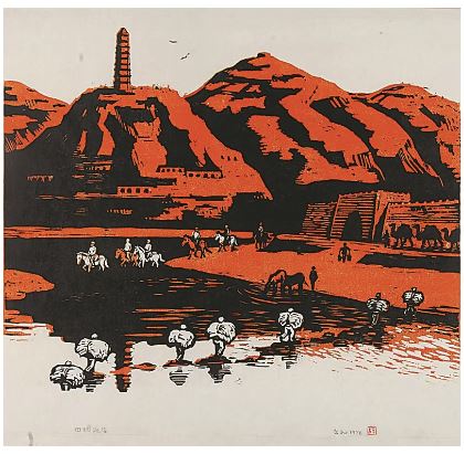 古安村:1991年底,古元被確診為癌癥晚期。20世紀(jì)90年代,古元不僅創(chuàng)作了一批黃河題材作品,還創(chuàng)作了一批駱駝?lì)}材作品。實(shí)際上,這些創(chuàng)作都是他在術(shù)后對(duì)人生和自我的重新審視。人生既有美好安靜的順流,也有異常艱難的逆流、漩渦和淺灘。在創(chuàng)作《激流勇進(jìn)》時(shí),古元已歷經(jīng)四次化療,身體極度虛弱。然而,他以頑強(qiáng)的意志力堅(jiān)持創(chuàng)作,通過(guò)描繪黃河漩渦與逆流而上的纖夫等意象,藝術(shù)化地傳達(dá)了其戰(zhàn)勝病魔的精神信念。此時(shí),他還創(chuàng)作了《西出陽(yáng)關(guān)》等駱駝?lì)}材作品,刻畫(huà)了駝隊(duì)在荒漠風(fēng)沙中艱難跋涉的視覺(jué)意象,同樣呈現(xiàn)出古元強(qiáng)烈的精神訴求。駱駝?lì)}材作品與黃河題材作品彼此呼應(yīng),共同體現(xiàn)了古元晚期創(chuàng)作中的生命哲學(xué)思考。駱駝堅(jiān)韌前行的精神、黃河激流勇進(jìn)的精神,不僅體現(xiàn)了古元個(gè)人的生命哲學(xué)思考,也升華為對(duì)民族精神與抗戰(zhàn)記憶的藝術(shù)詮釋。