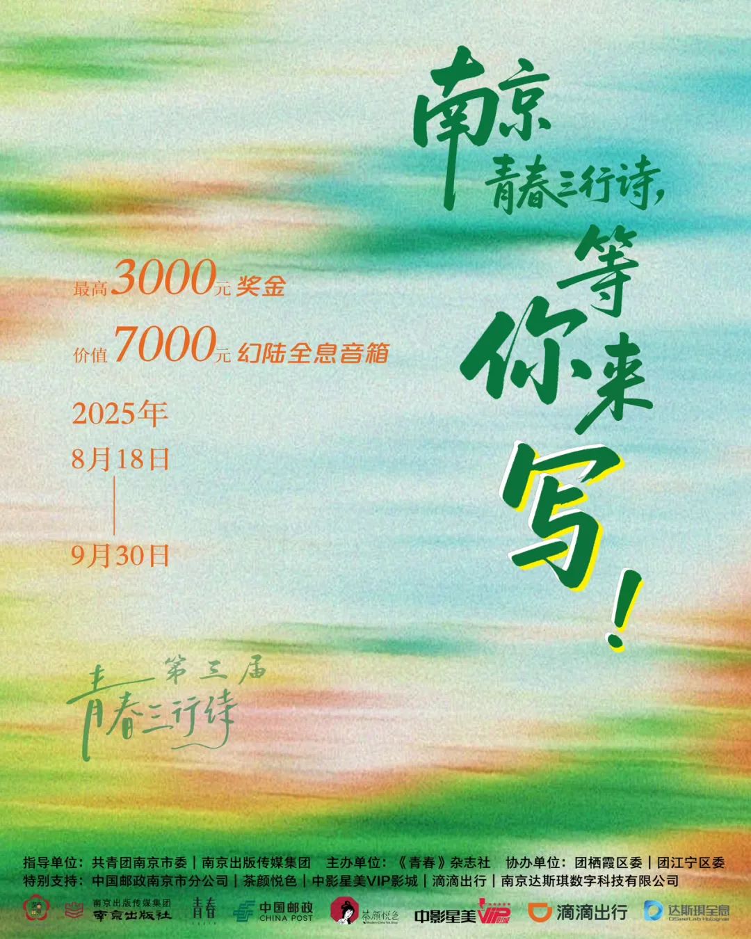 個人小紅書、抖音或視頻號任意一個平臺賬號發(fā)布原創(chuàng)作品,帶話題#青春三行詩 #我在南京的日子 #第三屆青春三行詩,并將發(fā)布鏈接及三行詩文本發(fā)送郵箱:qingchunshs@163.com
