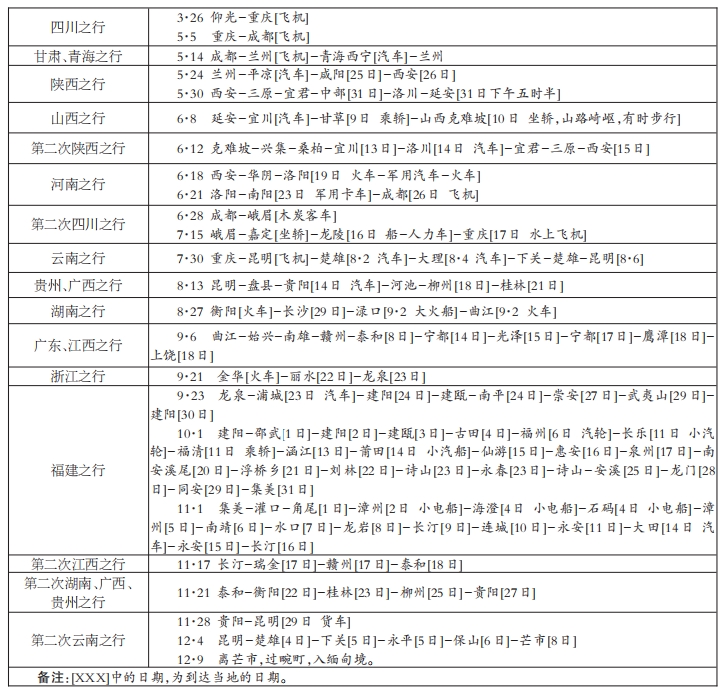 在漫天烽火中旅行,絕非易事。多年的兵戈擾攘,使得中國的交通線路多有阻斷,且陳嘉庚所到之處以高原、山地和丘陵等地形為主,山高坡陡,地形復(fù)雜,更加重了出行的困難程度。面對這些復(fù)雜情況,陳嘉庚也曾心懷忐忑,并對自己能順利完成跨越數(shù)省的旅途頗感欣慰。“他開始說當(dāng)他離渝由成都啟程時(shí),頗擔(dān)心自己不慣作長途旅行,可是這次居然能依期完成旅程,毫不感覺疲憊,這是非常愉快興奮的事?!保ā度A僑領(lǐng)袖陳嘉庚救國言論集》)然而,說是順利,乃依結(jié)果而論,若論過程,其實(shí)頗為曲折。一方面是交通不便,陳嘉庚以各色交通工具接力的方式才得以踏遍祖國這些河山。據(jù)統(tǒng)計(jì),除步行外,陳嘉庚乘坐的交通工具有十余種,火車、飛機(jī)、水上飛機(jī)、軍用飛機(jī)、汽車、貨車、軍用卡車、木炭客車、大火船、汽輪、小汽船、小電船、人力車、轎子等,可謂無所不包。另一方面是需要應(yīng)對旅途中時(shí)常發(fā)生的意外情況。例如,“坐轎,山路崎嶇,有時(shí)步行”;有時(shí)車壞,需臨時(shí)停留,“乘汽車離貴陽,中途車壞,晚住河池”;有時(shí)趕時(shí)間,常于凌晨、午夜出發(fā)或到達(dá)目的地,“午夜乘火車離開西安”“凌晨五點(diǎn)抵桂林”“午夜到上饒”“從貴陽,乘西南運(yùn)輸公司貨車,于29日半夜到昆明”。此外,惡劣的天氣也形成了嚴(yán)苛的挑戰(zhàn)。6月18日,自西安乘火車抵華陰途中,“當(dāng)時(shí)正值盛夏,車廂內(nèi)氣溫高達(dá)攝氏四十度”。(《陳嘉庚年譜》)