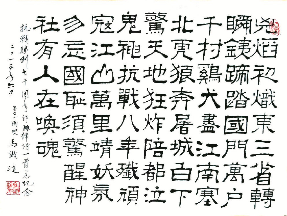 2024年8月,中國現代文學館曾主辦“浩然正氣——馬識途書法展”。在展覽中,中國現代文學館特意從字畫庫珍選了馬老極具代表性的書法作品,其中就有他在抗戰勝利70周年時所書的詩句,這幅書法是時年100周歲的馬老寫于2015年6月。兇焰初熾東三省,轉瞬鐵蹄踏國門。萬戶千村雞犬盡,江南塞北虎狼奔。屠城白下驚天地,狂炸陪都泣鬼神。抗戰八年殲頑寇,江山萬里靖妖氛。勿忘國恥須驚醒,神社有人在喚魂。