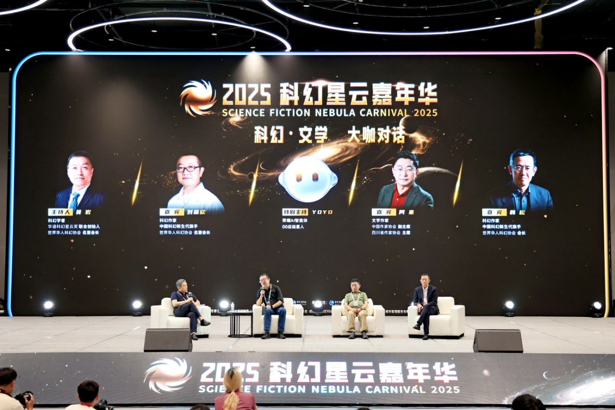 9月20日下午,本次嘉年華的重要活動——“科幻·文學大咖對話”在成都科幻館舉行。中國作協副主席、四川省作協主席、茅盾文學獎獲得者阿來,科幻作家劉慈欣、韓松,圍繞“人工智能與科幻未來的交融與想象”展開對談。活動由南方科技大學教授、華語科幻星云獎聯合創始人吳巖主持。值得一提的是,本次活動上,還有一位神秘嘉賓“OO后硅星人”——榮耀AI智能體YOYO,為大會增添了科幻色彩。