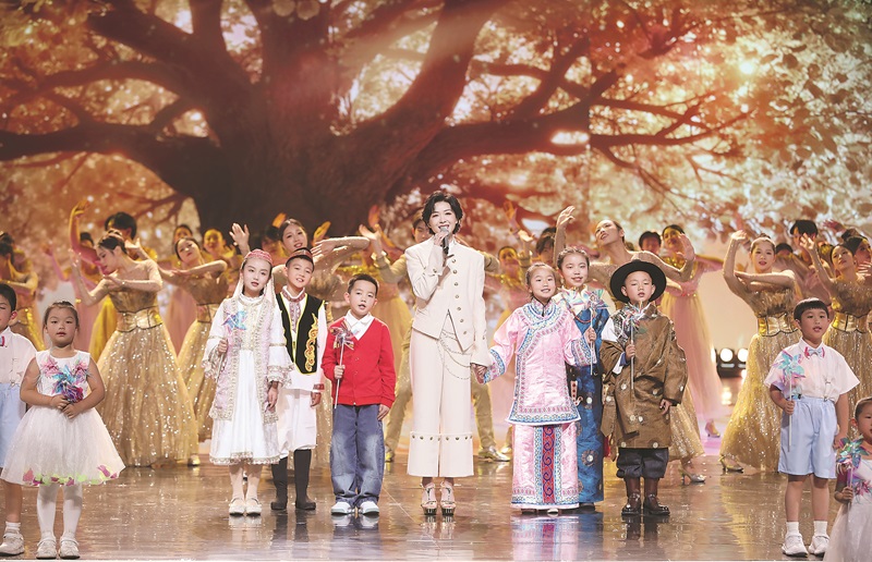 來自甘肅省甘南藏族自治州臨潭縣的6名小朋友與演員萬茜、芒果少年合唱團共同演唱歌曲《最好的未來》 馮海文 攝