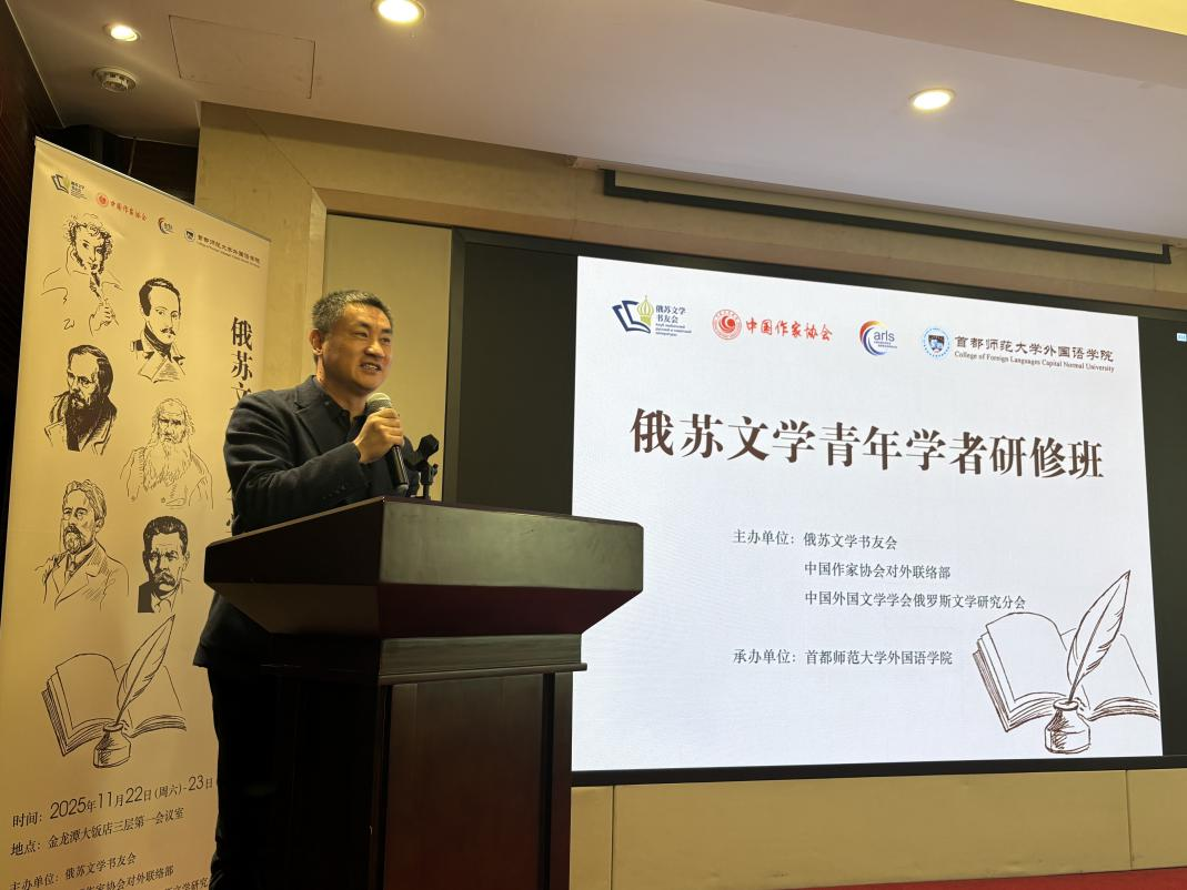 為賡續(xù)中俄文學(xué)交流傳統(tǒng),深化兩國(guó)人文合作,2025年11月22日至23日,“俄蘇文學(xué)青年學(xué)者研修班”在京成功舉行。作為“俄蘇文學(xué)書(shū)友會(huì)”的重要活動(dòng)之一,本次研修班由中國(guó)作家協(xié)會(huì)對(duì)外聯(lián)絡(luò)部、中國(guó)外國(guó)文學(xué)學(xué)會(huì)俄羅斯文學(xué)研究分會(huì)主辦,首都師范大學(xué)外國(guó)語(yǔ)學(xué)院承辦,旨在凝聚青年人才、提升研究水平,積極構(gòu)建俄蘇文學(xué)研究的“中國(guó)學(xué)派”。“俄蘇文學(xué)書(shū)友會(huì)”是在中宣部文藝局的指導(dǎo)下,由中國(guó)作協(xié)外聯(lián)部聯(lián)合有關(guān)部門發(fā)起的常態(tài)化、專業(yè)化、公眾化的中俄人文交流平臺(tái)。