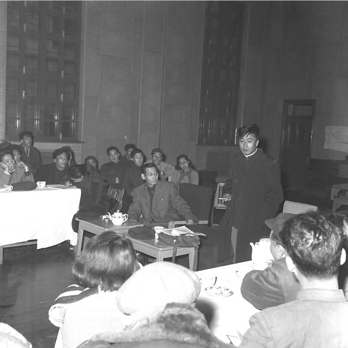 ②1958年,焦菊隱與《智取威虎山》劇組聽原著小說《林海雪原》作者曲波談創作