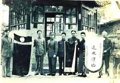 郁達夫(右二)等人向李宗仁(左三)獻旗