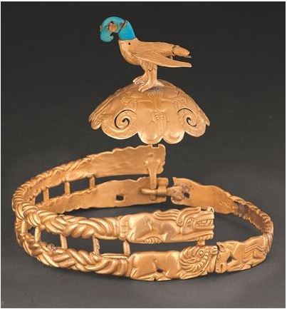 這里最引人注目的文物是鷹頂金冠飾,為“鎮(zhèn)館之寶”之一,年代約為戰(zhàn)國后期,由鷹形冠頂和金冠帶兩部分組成,表現(xiàn)了雄鷹俯瞰狼咬羊的情景。冠頂為半球形,浮雕4組狼吃羊的圖案,狼作臥伏狀,盤角羊前肢彎曲,后肢被狼咬住,呈反轉(zhuǎn)姿態(tài)。冠頂中央立一只展翅雄鷹,鷹身中空,由金片制成,身及雙翅飾羽毛紋;頭、頸由綠松石制成,中間用花邊金片隔開,好似項鏈;鷹鼻處插入金絲,將頭、頸與腹下相連,頭、頸可以左右搖動;尾部用金絲與鷹體連接,可左右擺動,栩栩如生。冠帶由3條半圓形繩索式金帶榫卯相合,金帶末端分別飾淺浮雕的臥虎、臥羊、臥馬。