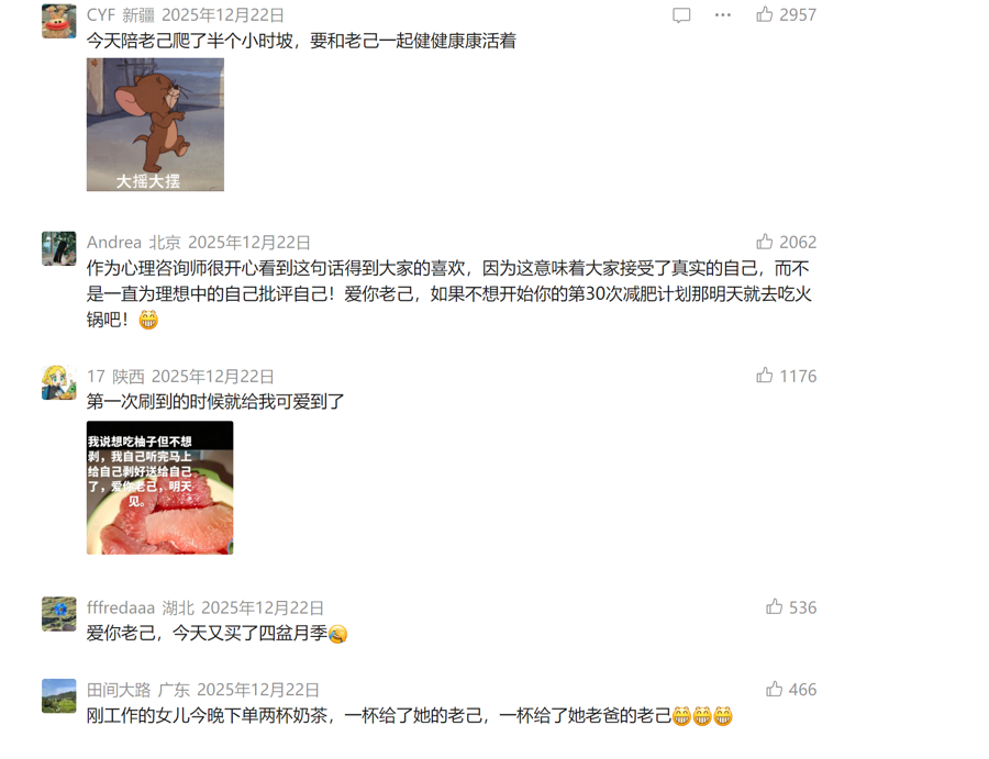 年末“老己”大火,從“第一杯敬自己”到“愛你老己天天見”再到“老來得己”,熱梗的變化足夠證明,從對廣闊世界的關注回收到“自己”,喝杯水、爬個坡、剝個柚子,用小事把自己養好,就是最好的成就。