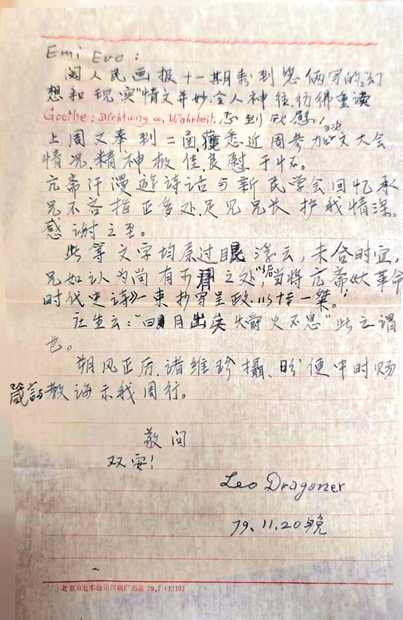閱人民畫報十一期看到您倆寫的:“幻想和現實”情文并妙,令人神往,仿佛重讀Goethe:Dichtung und Wahrheit*,感到欣慰!