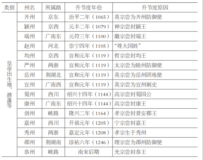第四,皇帝之“潛藩”“潛邸”,應升府并升為節度,這在宋代已形成制度?!白孀诘涔?,應系潛藩,皆升節鎮。”“故事,潛藩州建軍府名。舊制,天子即位,嘗所領州鎮,自防御州而下皆升軍名;若節鎮州則建為府?!币虼硕濇偅刑蟮呐既恍?,地理因素在里面不起什么作用,但在宋代,因此而升節鎮的恰恰最多。幾乎每一個皇帝在即位前都曾被封為某王,或在名義上為某州防御使、團練使、刺史,登基之后,這些州就要升節度、升府。某些“潛邸”州,祖宗在位時未來得及升節鎮,隔了百來年,最終還是升了。經過兩宋三百余年,因“潛藩”而升節鎮的就達二十余個,占宋代新升節鎮大半。此制度在徽宗時“造就”了一大批節度州,但在南宋并未完全得到實行,“比年以來,升蜀州為崇慶府,劍州為隆慶府,恭州為重慶府,嘉州為嘉定府,秀州為嘉興府,英州為英德府。蜀、劍既有崇慶、普安軍之額,而恭、嘉以下獨未然。故幕職官仍云某府軍事判官、推官,大與府不相稱,皆有司之失也”?!肮庾谧詷s州刺史進封恭王,……而榮州至今不錫軍名,蓋中書之誤?!逼洹笆А薄罢`”之一,是潛藩原非節度州者必當升節度,而南宋不然,如上述榮州至宋末仍為軍事州,孝宗嘗為和州、貴州防御使,理宗嘗為成國公,度宗嘗為貴州刺史,卻未升和、貴、成、英等州為節度州;其“失”“誤”之二,是南宋時不再嚴格遵循潛藩先升節度后升府的原則,某些州已升府卻仍未升節度,如英州(英德府)。某些時候,潛藩升節度州有滯后性,比如哲宗嘗為均國公,升均州為節度在徽宗宣和元年,這也是制度未完全施行的表現。嘉州為寧宗潛藩,然升節度在開禧元年(1205),距寧宗即位已有十余年。秀州為孝宗出生之地,不過其于嘉定元年升嘉興軍節度之時,距孝宗即位(1162)已近半個世紀。恭州(重慶府)于南宋后期最終升作節度,然距其于淳熙十六年升府已隔多年。