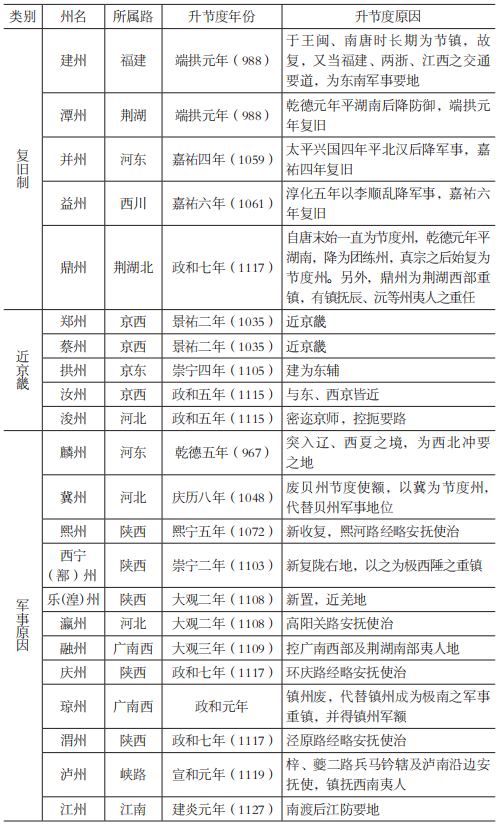 一是北宋后期陜西新增節度州,如慶、渭、樂、西寧、熙各州,皆在當時永興軍(轉運使)路西界及秦鳳路,若非經略安撫使路治,即為鎮撫少數族之要地。相比之下,河北路節鎮增加較少:冀州是因代替貝州而成為河北東南的軍鎮,而瀛州則為安撫使路治。這兩路的狀況符合北宋的軍事局勢:河北路自唐以來即因與契丹的爭戰而多節鎮,至宋,爭戰未有加劇,故表現在州的等第上,也較為穩定;而北宋后期神、哲、徽三朝向西北拓土在一定程度上獲得成功,不論是否有進一步開拓疆土的意向,已得的熙河蘭會等地總需守御。因而,雖然陜西路原來之節度州已遠多于河北路,仍增置了許多節度州。