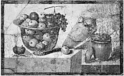各類食材和食器是龐貝壁畫的一個常見主題,這類作品訴諸生活的真實,表現出物品靜置的平衡感與靜穆之美,因此也有學者將這類呈現靜置物品的壁畫視為古羅馬的“早期靜物畫”。例如“朱莉亞·菲利克斯之家”里的一幅壁畫,左側透明的水晶杯里盛放著蘋果、梨、石榴,一串葡萄掛在杯沿,右側的陶罐單獨裝滿了葡萄粒,這應當是個葡萄豐收的季節。中間斜置的雙耳陶罐中或許裝滿了醇香的葡萄酒,暗示著房屋主人已備好新鮮的果蔬與美酒,等待客人到訪。這樣的食材靜物畫在龐貝城內并不少見,龐貝人對美食和宴飲的嗜好可見一斑。